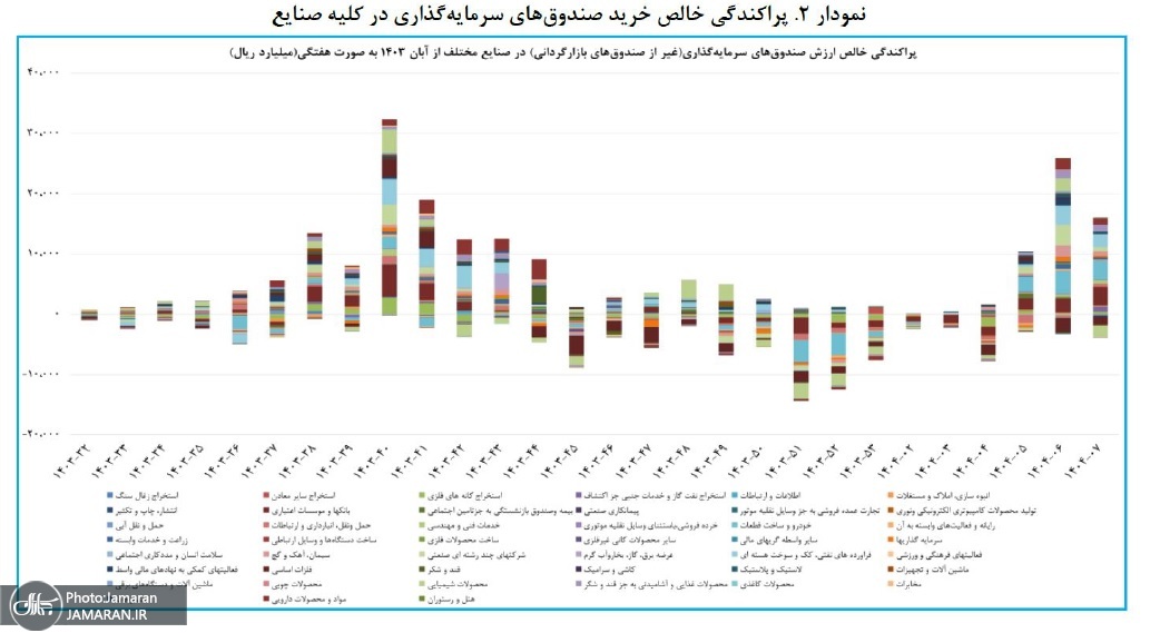 1 – به منظور بررسی ادعای مطروحه مبنی بر ورود مرحله ای صندوقهای سرمایه گذاری، خالص ارزش خرید سهام این صندوقها (به جز صندوقهای بازارگردانی) به تفکیک صنایع و به صورت هفتگی از ابتدای آبان ماه 1403 مورد بررسی قرار گرفت. همانگونه که در نمودار 1 نیز نشان داده شده است، در دو مقطع اصلی که صندوقهای سرمایه گذاری خالص ارزش خرید مثبت و قابل توجه داشته اند (باکس قرمز رنگ)، خرید در صنایع متفاوت و به صورت نسبتا متوازن صورت گرفته، بنابراین ادعای مطروحه مبتنی بر ورود مرحله ای صندوقها به صنایع مورد تایید نیست.