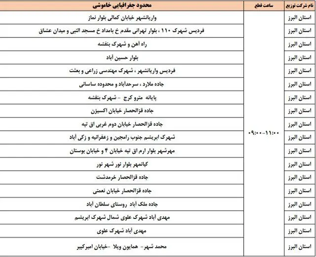 برنامه قطع برق-سهشنبه ۲۶ فروردین