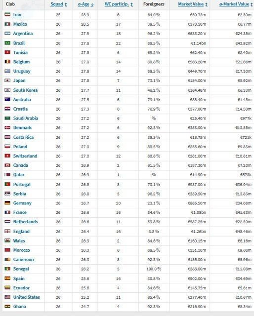 ایران با میانگین سنی ۲۸.۹ سال، مسنترین لیست جام جهانی قطر را به خود اختصاص داده است. میانگین سنی مکزیک ۲۸.۵ و آرژانتین ۲۷.۹ است تا پس از ایران در رتبه دوم و سوم مسنترین تیمهای جام جهانی قرار بگیرند. غنا با میانگین سنی ۲۴.۷ دارای جوانترین ترکیب در جام جهانی قطر خواهد بود.