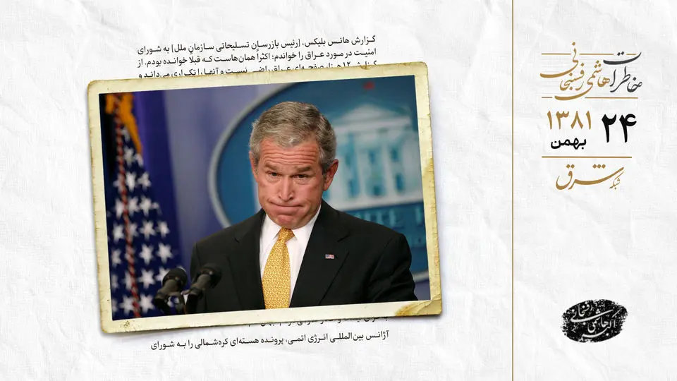 گزارش هانس بلیکس، [رئیس بازرسان تسلیحاتی سازمان ملل] به شوراى امنیت در مورد عراق را خواندم؛ اکثراً همان‌هاست که قبلاً خوانده بودم. از گزارش 12 هزار صفحه‌اى عراق راضى نیست و آنها را تکرارى مى‌داند و جواب اینکه مواد تهیه‌شده براى تولید میکروب سیاه‌زخم را که براى حدود شش تُن میکروب کافى بوده، اما فقط 850 لیتر تولید شده را نداده و تلاش براى تولید موشک‌هاى بیش از بُرد مجاز داشته است.