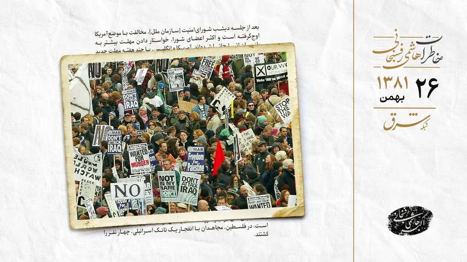 امروز در یک اقدام بى‌سابقه و هماهنگ، در ۱۶۰ کشور در قاره‌هاى‌ آمریکا، اروپا، آفریقا، آسیا، اقیانوسیه و خاورمیانه، با حضور میلیون‌ها نفر، تظاهرات ضدجنگ‌طلبى‌ آمریکا برقرار بود.