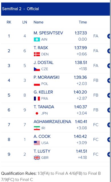 قایقهای اول تا سوم به فینال A، قایقهای چهارم تا ششم به فینال Bو قایقهای هفتم تا نهم به فینال C رفتند.