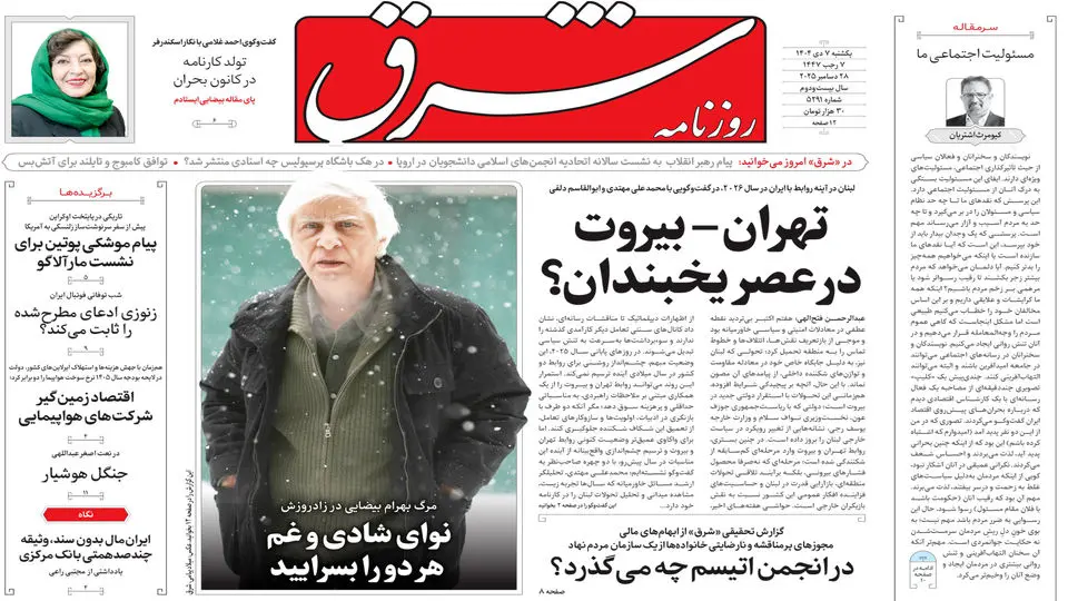روزنامه شرق یکشنبه ۷دی ۱۴۰۴ شماره ۵۲۹۱