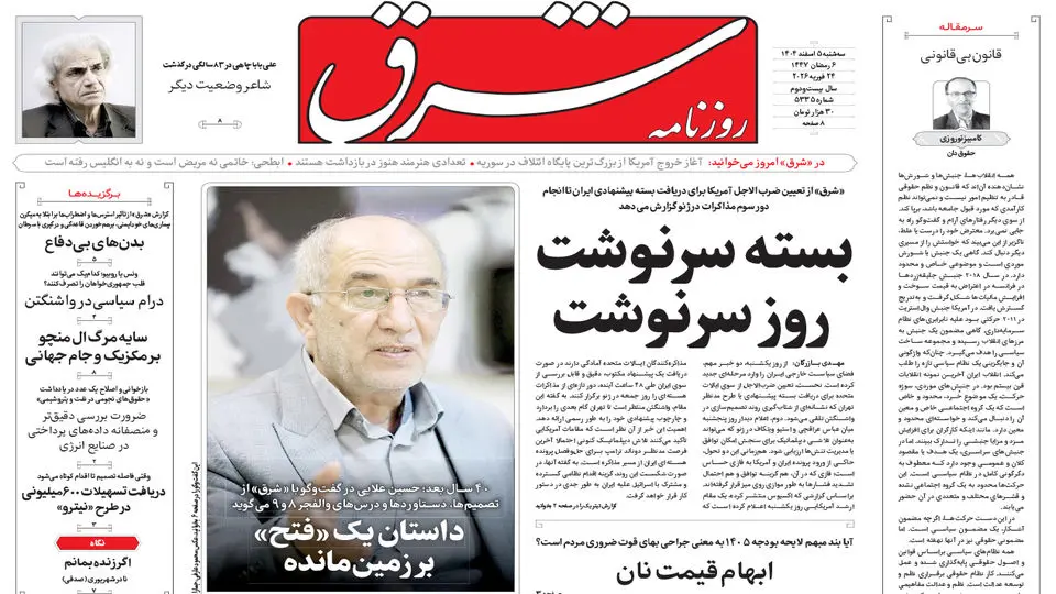 پی دی اف روزنامه ۵ اسفند ۱۴۰۴ ۰۰:۰۰ روزنامه شرق سه شنبه ۵ اسفند ۱۴۰۴ شماره ۵۳۳۵ به گزارش گروه رسانهای شرق، آخرین شمارههای منتشر شده روزنامه شرق را از طریق این لینک ببینید. مهمترین مطالب روزنامه شرق امروز روزنامه شرق لینک کوتاه کپی شد کدخبر: 1090052