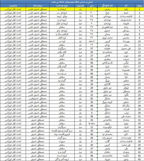 ۱۱:۳۰ - روابط عمومی اورژانس کشور، همچنین اسامی، سن و نوع جراحت ۴۳ تن از مصدومان این حادثه را اعلام کرد که در جدول زیر آمده است: