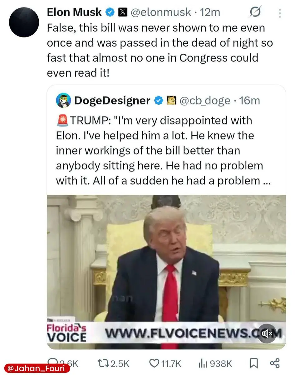 ایلان ماسک در واکنش به صحبتهای ترامپ گفت: نادرست است، این لایحه حتی یکبار هم به من نشان داده نشد و در نیمهشب بهقدری سریع تصویب شد که تقریبا هیچکسی در کنگره فرصت نکرد آن را بخواند.