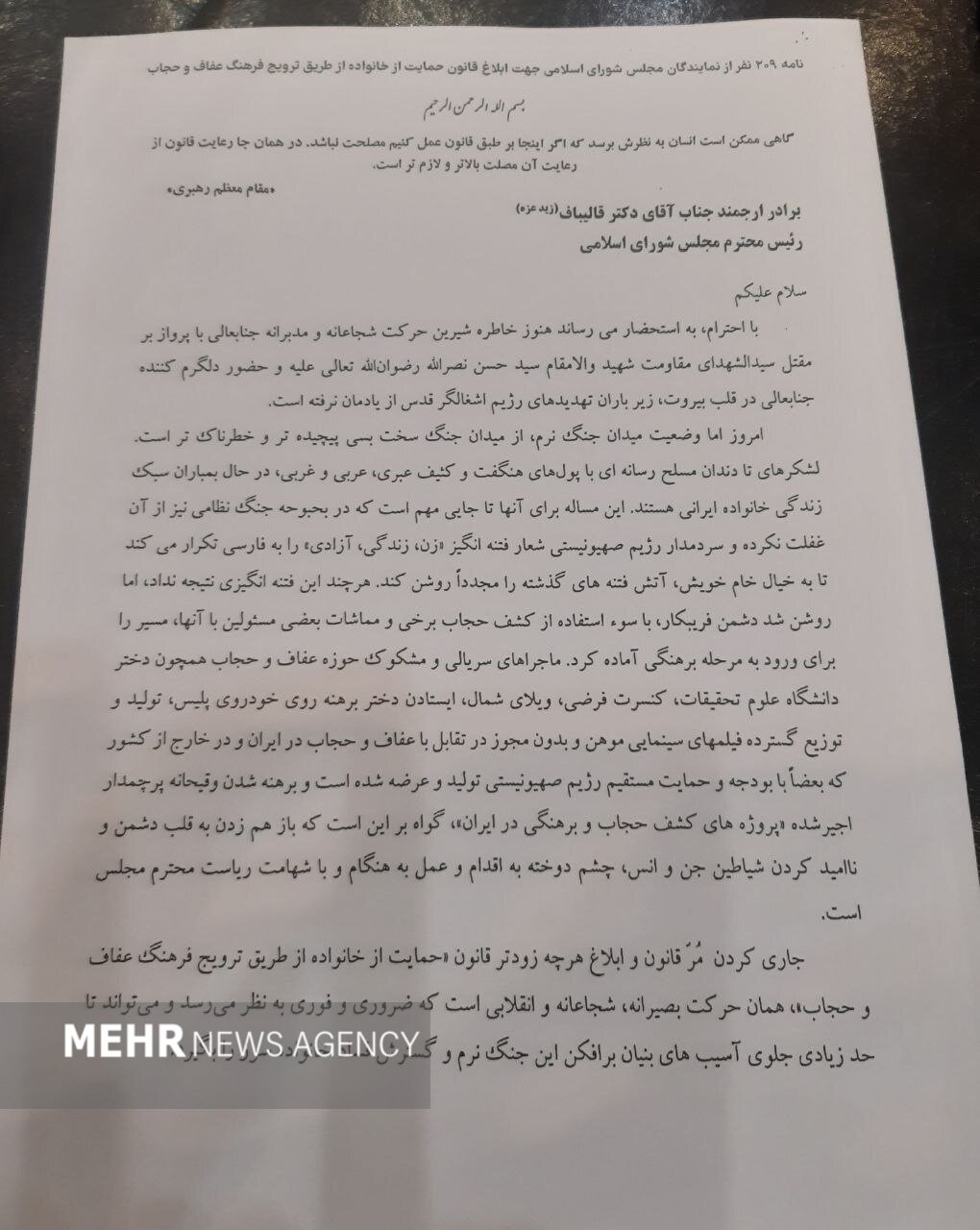 بر اساس این گزارش، نامه نمایندگان مجلس خطاب به قالیباف به شرح زیر است؛